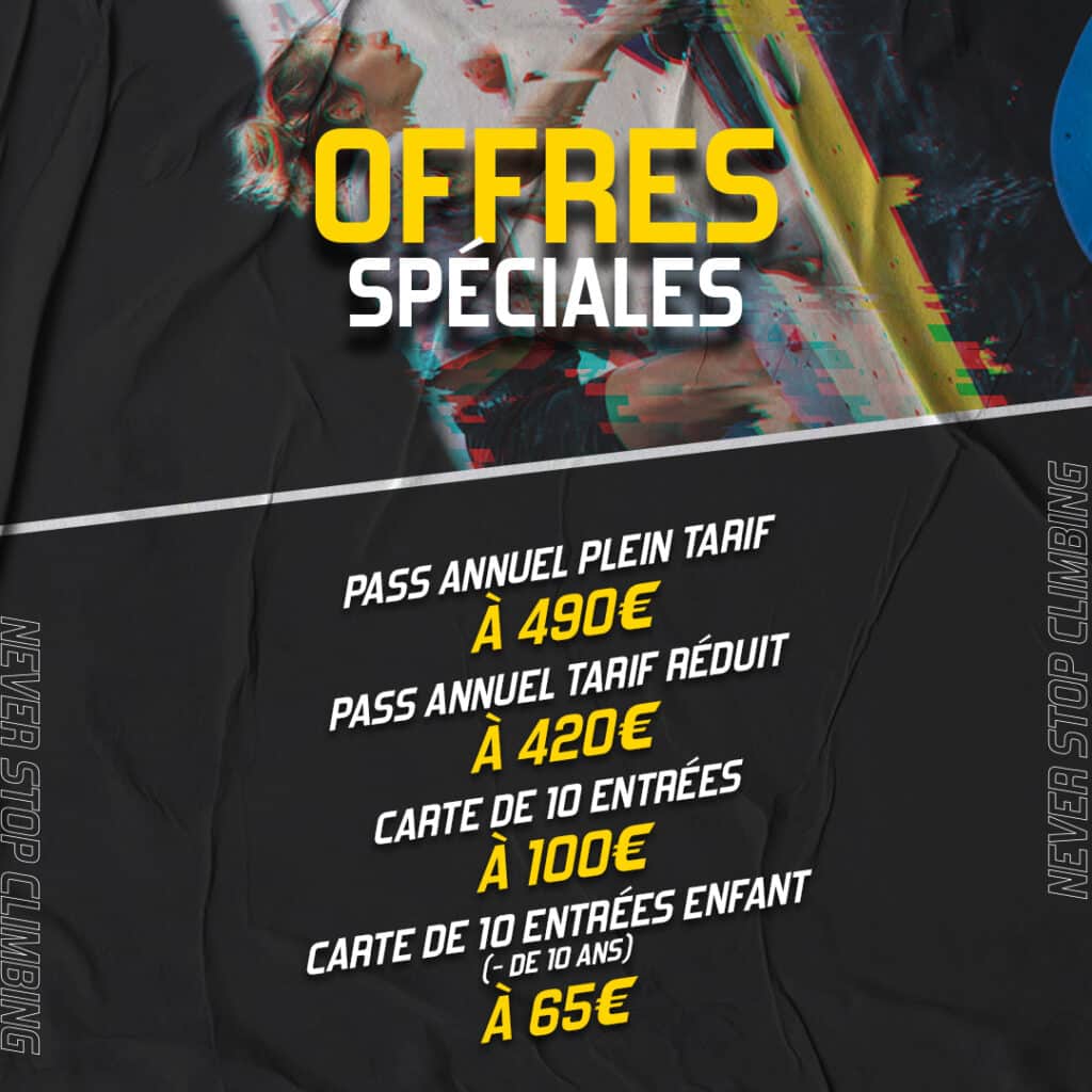 Tout comme notre salle de bloc des Yvelines et ses espaces (sauna, espace de renforcement musculaire, outils d’entrainement, …) est accessible en illimité à la journée pour chaque entrée, l’offre sera accessible toute la semaine, jusqu’au dimanche 31 mars inclus. Mais au-delà, ce ne sera plus le cas, alors ne tardez pas et foncez sur notre SHOP en ligne ou à l’accueil de notre salle dès ce lundi 25 mars, pour bénéficier de ces offres ouvertes à tous les grimpeurs !