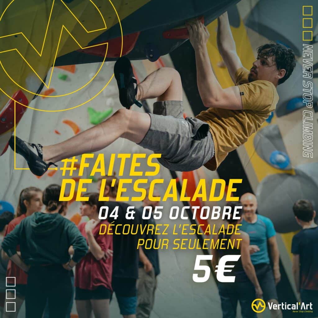 Nombreux sont les françaises et français à avoir été fasciné par l’escalade lors des Jeux Olympiques de Paris. Les 4 et 5 octobre prochains, Vertical’Art SQY vous donne la possibilité de venir pratiquer par vous même l’escalade de bloc lors de la « Faites de l’Escalade« , organisée en partenariat avec l’Union des Salles d’Escalade (UDSE). Pour la deuxième année consécutive, notre salle, à 5 minutes de Versailles, vous ouvre ses portes à l’occasion de cet événement incontournable, et vous propose de découvrir ou redécouvrir l’escalade pour seulement 5€, prêt de chaussons d’escalade compris !